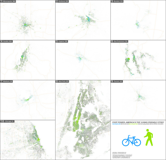 idvsolutions.comBicycling.com came out with a ranking of the top US cities for bicycling. I took their top ten cities and dot mapped every commuter in and around them, colored by their method of commute, to get …