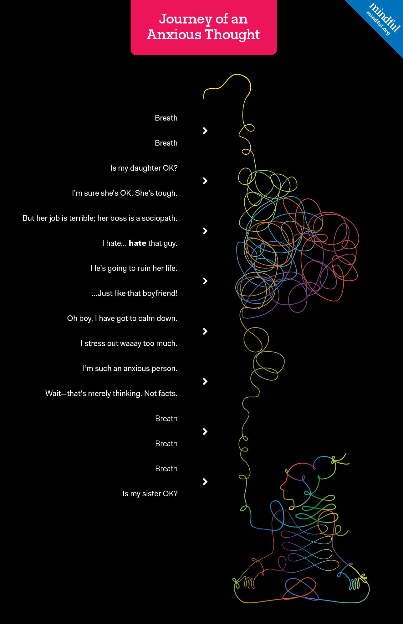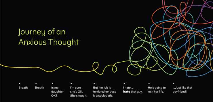 Mindfulness asks us to simply notice the storylines we create in our minds without trying to change them. Meditation gives us the space to choose not to react to those things that trigger our anxiety.